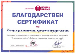 „Агенция за контрол на просрочени задължения“ АД е наш надежден и отговорен партньор. Агенцията се отличава и със своята лоялност към БНП Париба Пърсънъл Файненс С.А., клон България.